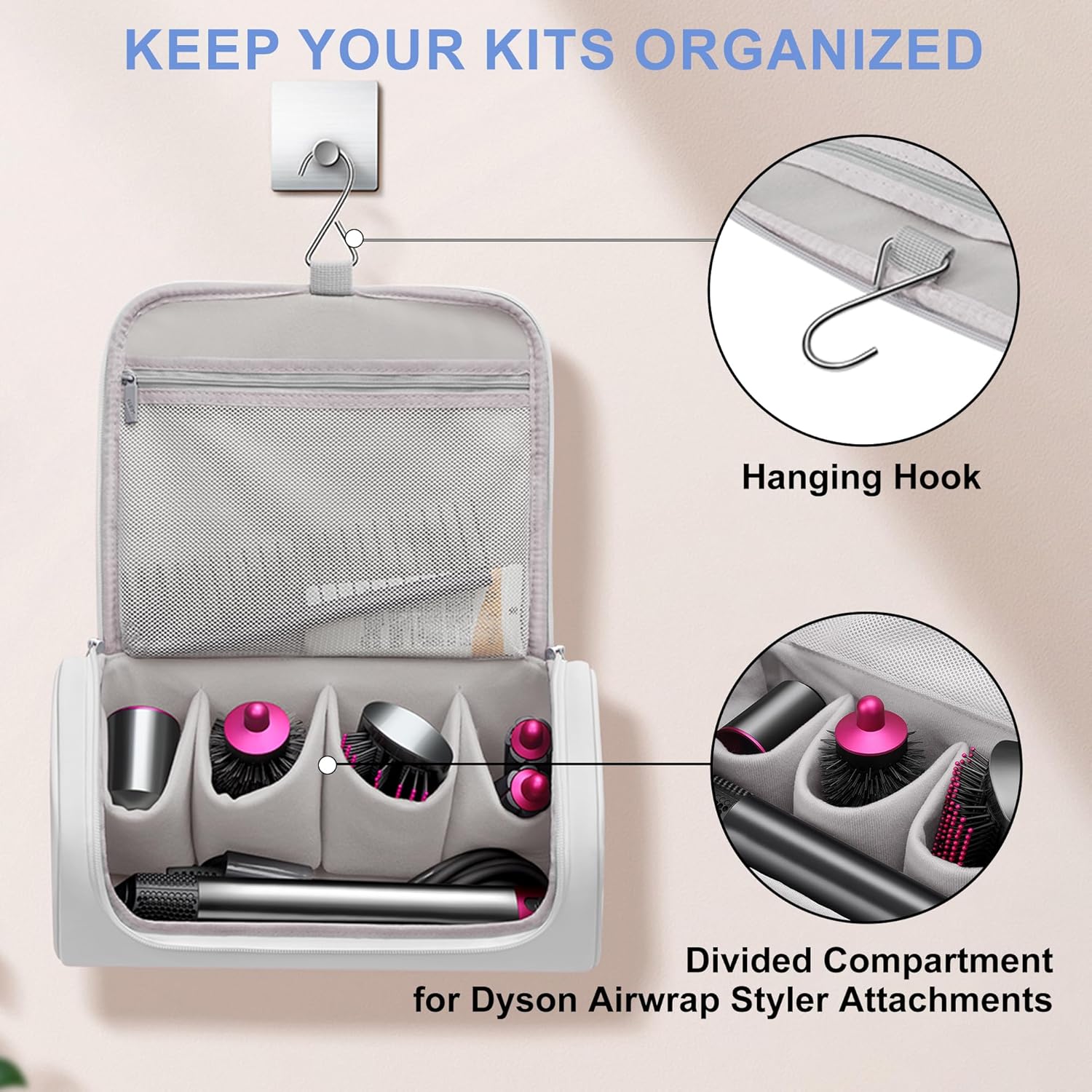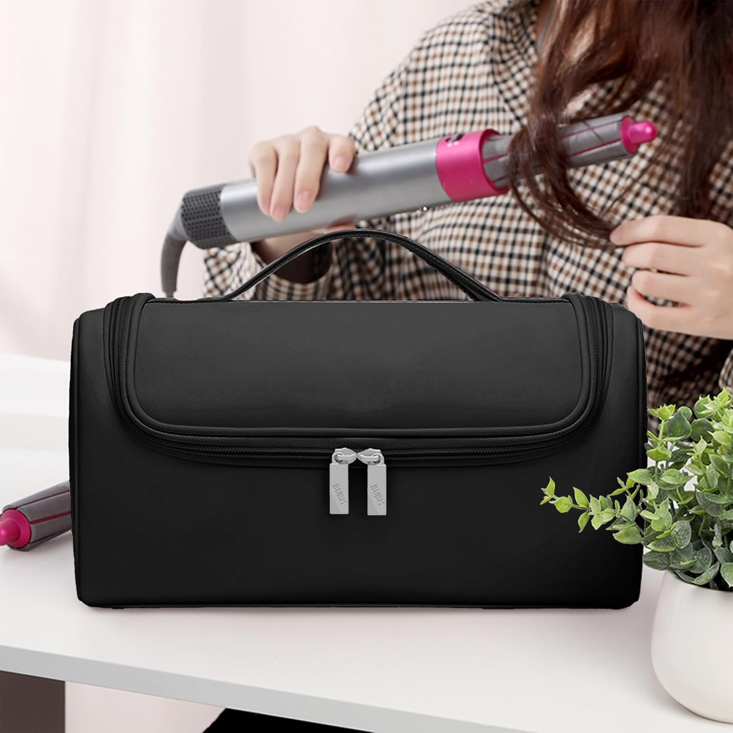 Easy to carry: The Linpr Travel Storage Bag has a handle on the top end that allows the user to carry it easily out of the house. The handle is ergonomically designed so that the user can carry it for a long time without getting tired. When the Linpr Travel Case is opened, there is a hook at the top of the lid that allows the Linpr Storage Bag to be hung on the wall so that the user can put more things on the table and maximise the use of space. Extra large capacity: Measuring 12.4*5.51*6.49inch, the Linpr Accessories Organizer fits perfectly in the Dyson Hair Dryer and Attachments. the extra large capacity also allows the user to put down other items they want to put in, such as various cosmetics. One Linpr Case Holder is all a woman needs to carry her make-up when travelling. High-quality material: the surface of Linpr Storage Organizer Bag is made of high-grade PU, which has a soft touch and makes the user like the texture as soon as he touches it. Not only is this material less likely to leave marks when folded, but it is also waterproof and scratch-resistant, and the Linpr Storage Bag's interior is made of soft fleece, which protects the contents from damage. Well constructed: the interior of the Linpr Travel Storage Bag is roughly divided into four sections. The first section can hold small items such as data cables. The second section can hold valuable items such as cosmetics. The third section has a total of 4 separate sections for individual accessories to be stored separately and the fourth section is the main compartment, which occupies the largest space and is used for hair dryers or curling irons. Of course these are all suggestions and you can put whatever you want inside anywhere you like. Fine details: the Linpr Travel Storage Bag is very well detailed with tight, rounded and full lines. The zips are bi-directional, allowing the user to have better control over the size of the opening and closing. Also each zip head has rectangular pegs to allow the user to use the zip with less effort and the zip is smooth and non-jamming to keep you in a good mood.